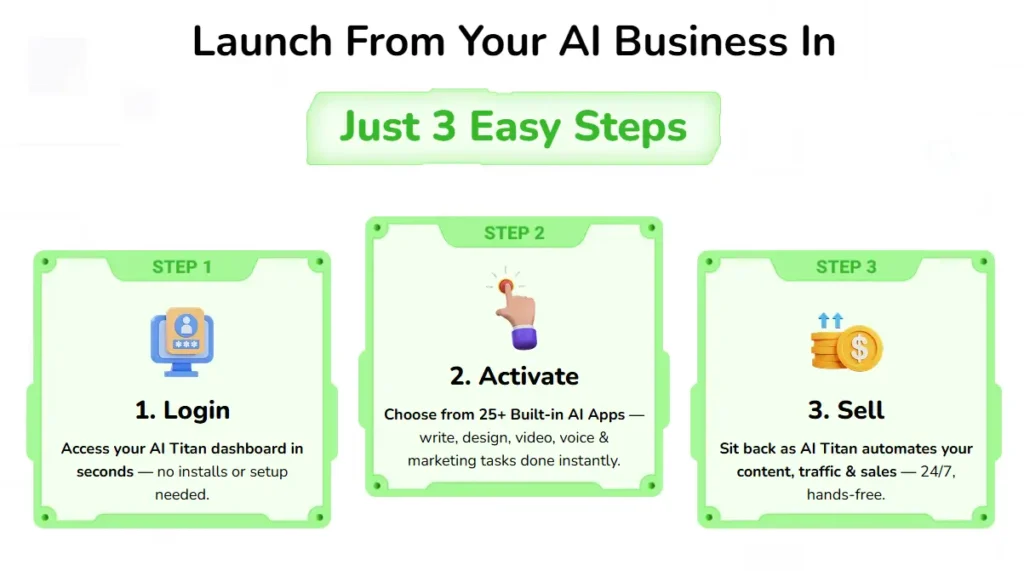 AI Titan works in a few simple, beginner-friendly steps that anyone can follow — even without technical skills or prior marketing experience.