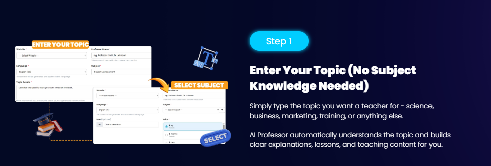 No teaching background or technical skills needed. The built-in AI Professor engine intelligently structures topics to create clear, accurate, and professional lessons, explanations, and study materials for courses, blogs, coaching, and digital education platforms.
