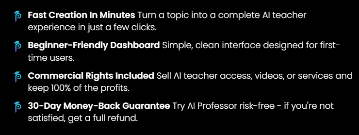 Whether you’re an educator, creator, entrepreneur, or complete beginner, AI Professor gives you the easiest way to create professional, engaging, and scalable educational content — without complexity, overwhelm, or experience.