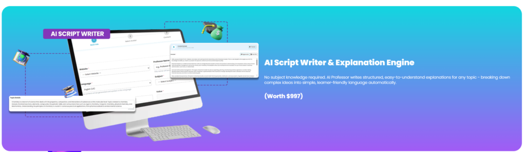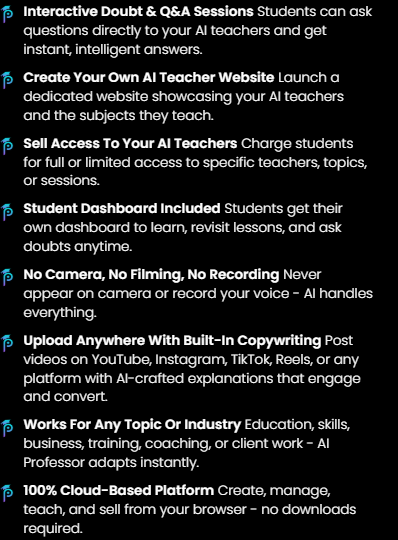 This system combines guided training with a built-in AI knowledge engine that handles content structure, clarity, accuracy, and human-like delivery. Its secret weapon? A powerful virtual “AI Professor” that understands topics deeply and explains them step by step — making complex subjects simple and easy to learn. It works perfectly for online courses, coaching programs, blogs, YouTube scripts, and digital education platforms — delivering professional-grade results on autopilot.